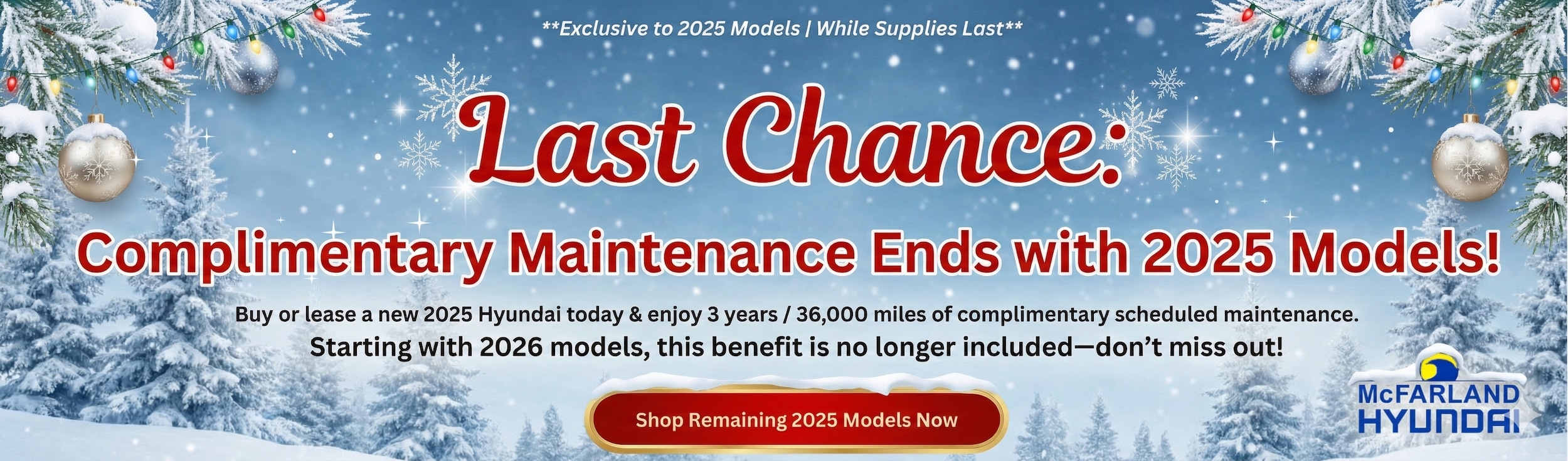 Don't Miss Out! 2025 Hyundais are the last model year to include 3 Years / 36,000 Miles of Complimentary Maintenance. Shop Remaining Inventory Today!